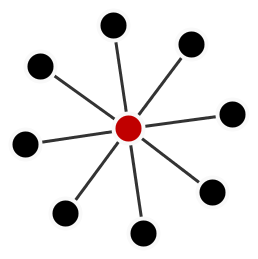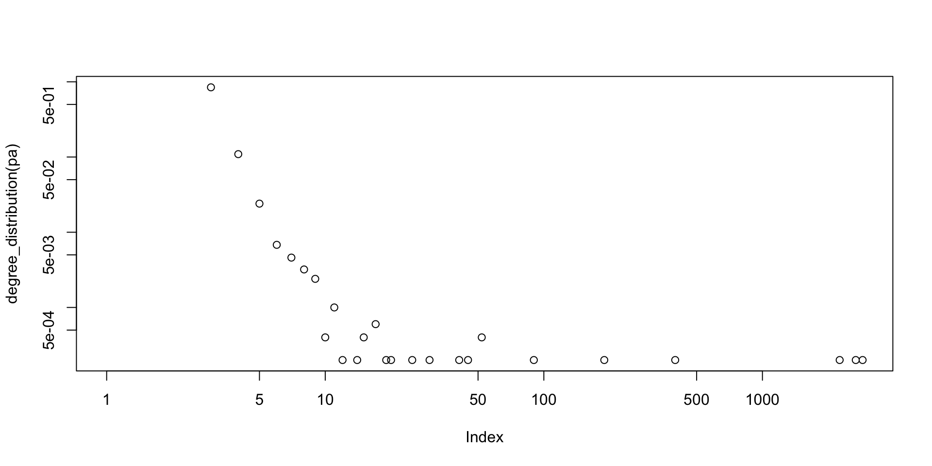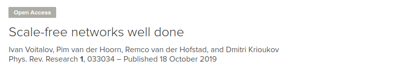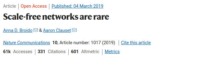 A scale-free network is a network whose degree distribution follows a power law (asymptotically). The fraction \(P(k)\) of nodes in the network having degree \(k\) is given by \(P(k) \sim k^\boldsymbol{-\gamma}\)