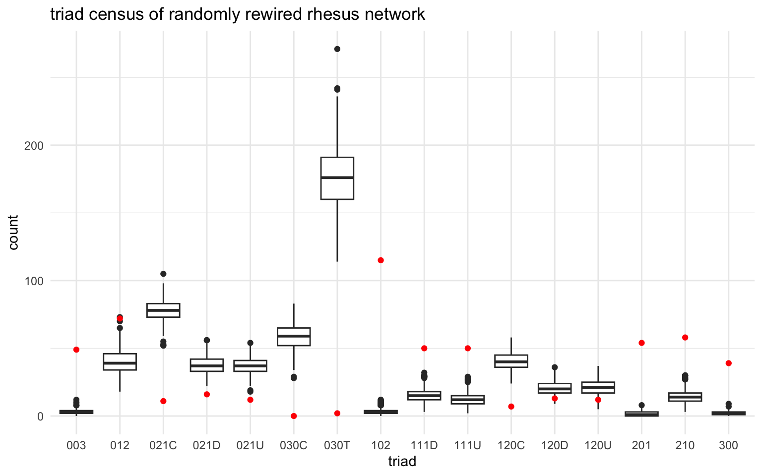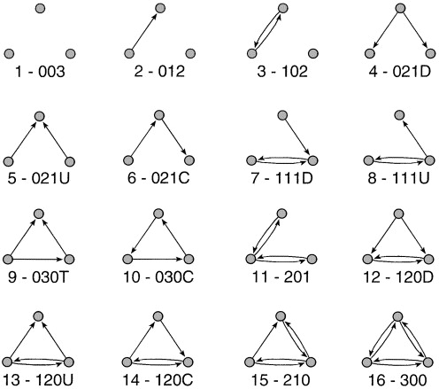 The triad census consists of a classification of all directed triads into one of 16 different categories. The distribution can be compared against null models to test for the presence of configural biases (e.g., transitivity bias)