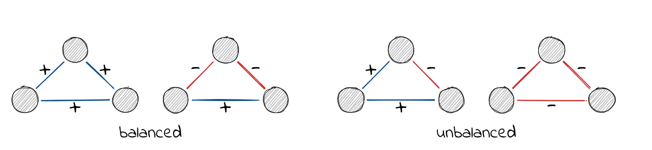 Extension: A network is balanced if i.a., it can be partitioned into two vertex subsets, such that intra-group edges are all positive and inter-group edges are all negative.