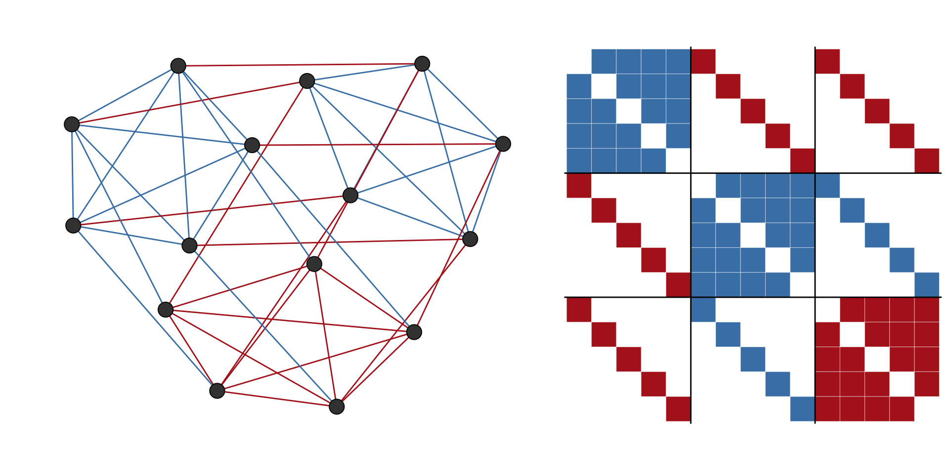 In signed blockmodeling, the goal is to determine \(k\) blocks of nodes such that all intra-block edges are positive and inter-block edges are negative
